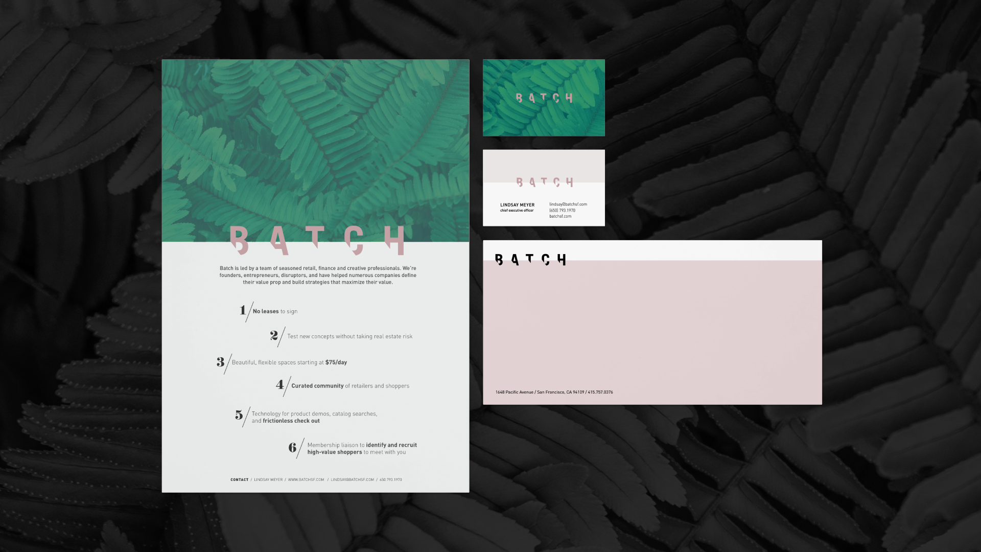 We created a brand tone that speaks to the variety of retailers and artisans that sell their goods at Batch locations, encompassing everything from welcome kits and stationery to dimensional, marquee activations of the logo and wayfinding signage.